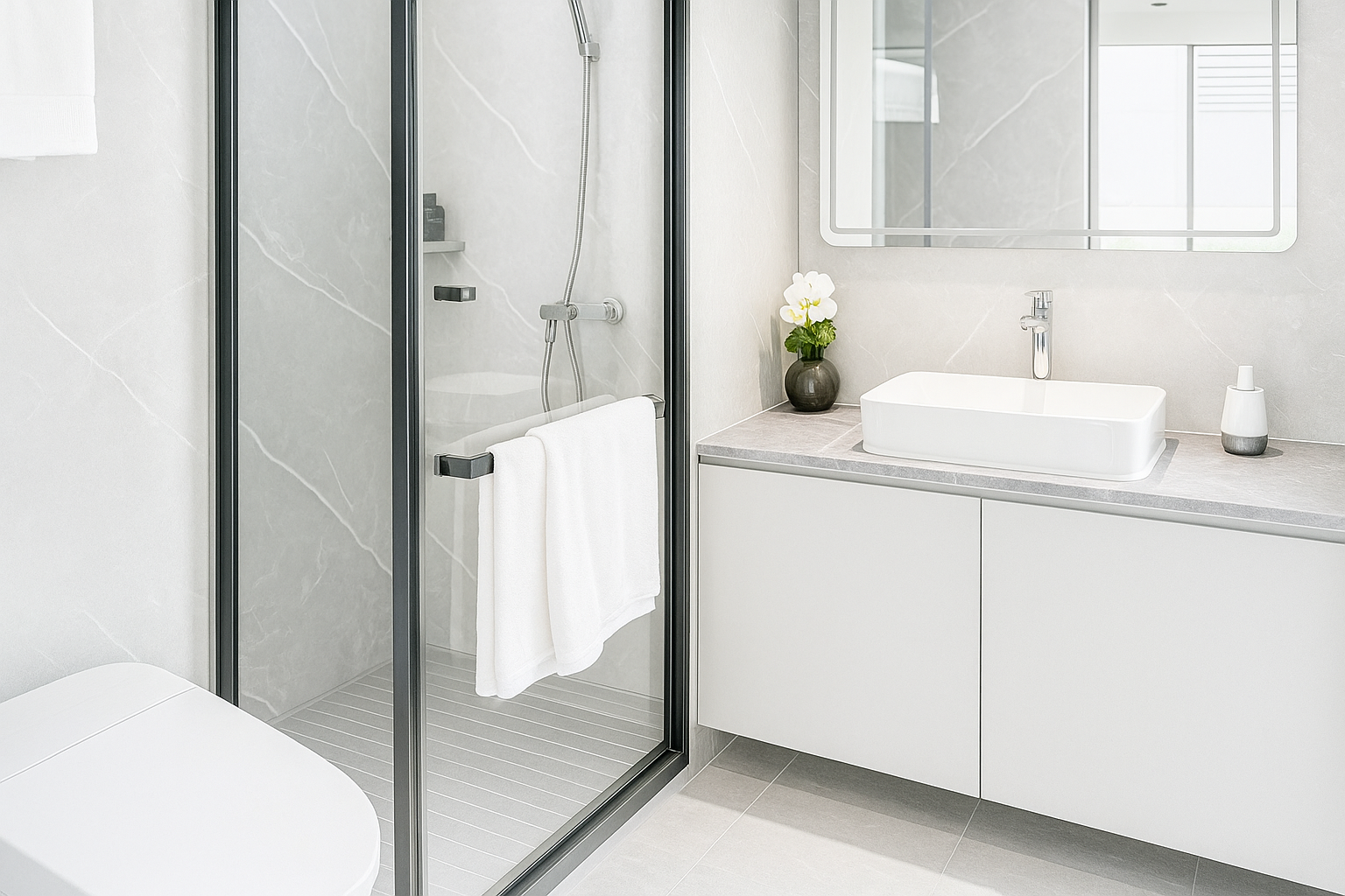 Elegantes Bad mit Dusche, WC, Waschtisch und allen Anschlüssen – voll ausgestattet, anschlussfertig und auf maximalen Komfort ausgelegt.